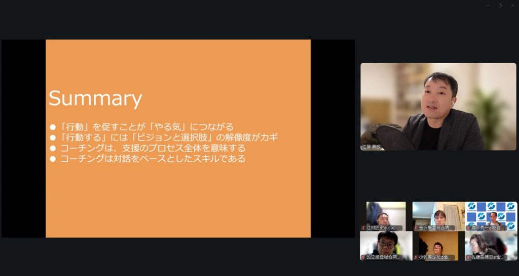 島根大学医学部附属病院の江草先生を講師にお招きし、現場で役立つコミュニケーションスキル、コーチングの手法を学びました。